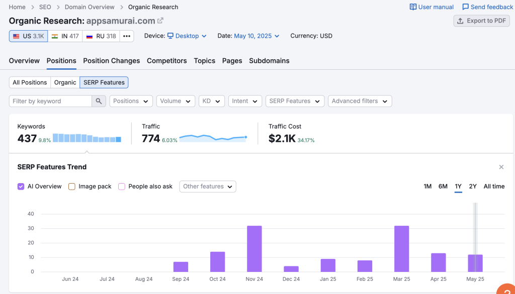 Aralık ayına girerken “oldu ya galiba bu iş” derken, HCU güncellemesi geldi ve AIO payımız tekrar düştü. Ocak ayında tekrar hareketlilik oldu, Mart ayında ise yine Kasım’ı yakaladık, appsamurai.com’un yer aldığı ve sonuç sayfalarında gösterilen toplam AIO sorgusuna karşılık %3 payımız vardı. Gördüğünüz gibi Nisan ayında tekrar düştü. Ama bu sefer de farklı bir şey oldu. Tüm bu süreçte tamamen user-intent odaklı gittiğim için People Also Ask gösterimlerimiz tavan yaptı. User-intent odaklı derken, kullanıcının bir sonraki arama sorgusunu modelleyip, tahmin etmek üzerine ilerliyordum, hala öyle gidiyorum.
