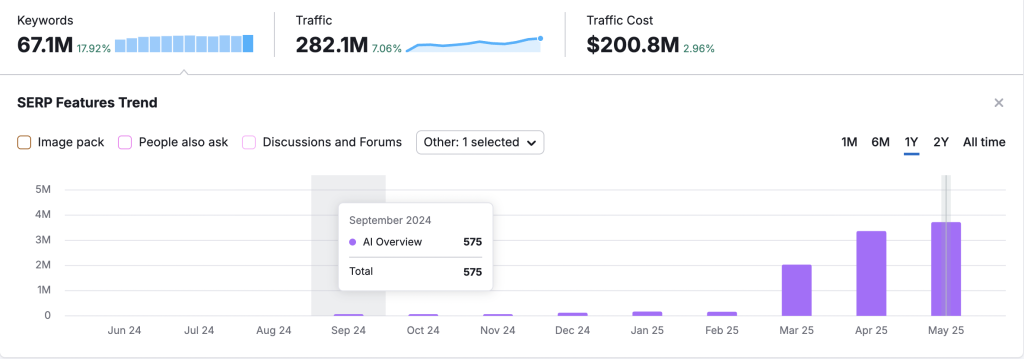 Aynı ay içinde üzerine inanılmaz yazılıp çizilen ve hiç kimsenin trafiğini 3’e 4’e hatta 5’e katladığını duymadığım Google algoritma sızıntısı gerçekleşti(bende de böyle bir sonuç yok bu arada, BrightonSEO’da da sahnede sordum, kimse el kaldırmadı). Yılın üçüncü çeyreğinin ardından ise SearchGPT sonrası, tıpkı Reddit’te olduğu gibi AIO kartlarının olduğu sonuç sayfası birden artmaya başladı. Mart 2025 sonrası ise “patladı”