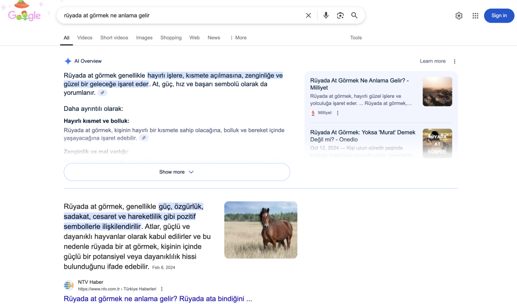 -> Peki bu güncelleme trafiğimizi sert vurursa tamamen buraya mı odaklanmalı? Bence asıl soru bu olmalı. Bence tam odak buraya yönelmek, yani AIO sorgusundaki payımız artırmak doğru değil. Optimize ettikçe ve kart gösterimleriniz arttıkça trafiğin artmadığını, düştüğünü birincil elden gözlemleyebileceksiniz. Aşağıda “rüyada at görmek” ile ilgili bir kart var. Rüyada at gören birisi, öğrenmek istediği bilgiyi buradan alıp tatmin olacaksa, arama yolculuğu devam etmeyecek. Dolayısı ile bu tarz içerikleriniz varsa kötü bir haberim var…